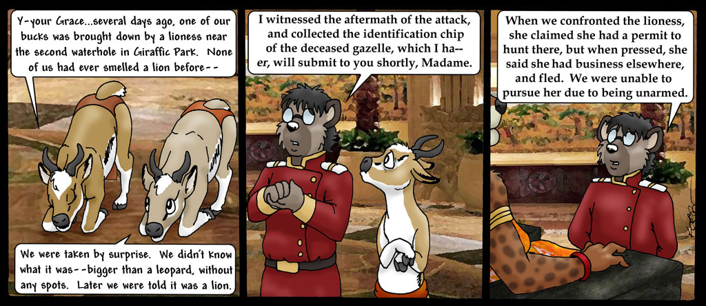 TanGazelle: Y-your Grace... several days ago, one of our bucks was brought down by a lioness near the second waterhole in Giraffic Park.None of us had ever smelled a lion before—