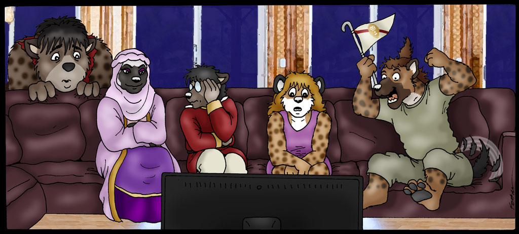(The gang on the couch, watching the duel video. Murphy cowers behind the couch, Jade smiles primly, Fred averts his eyes, Kathy looks horrified, Koz waves pennant and cheers)